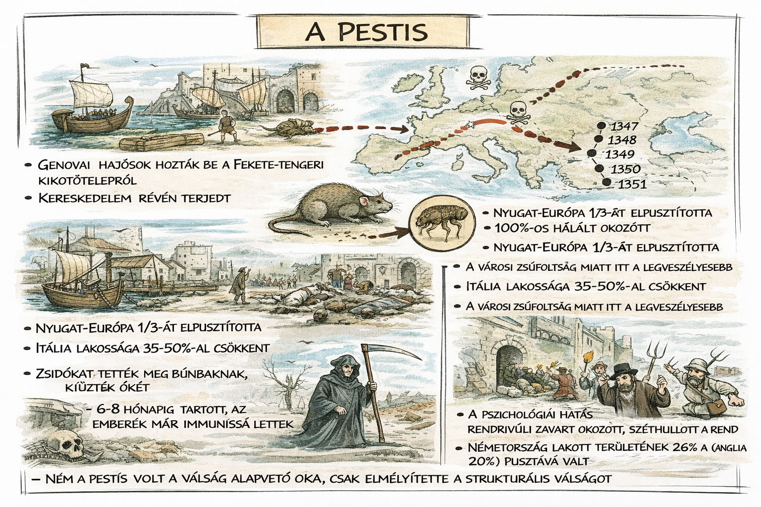 - legyengült Európát érte a pestis, 100%-os halált okozott; Nyugat-Európa 1/3-át elpusztította;