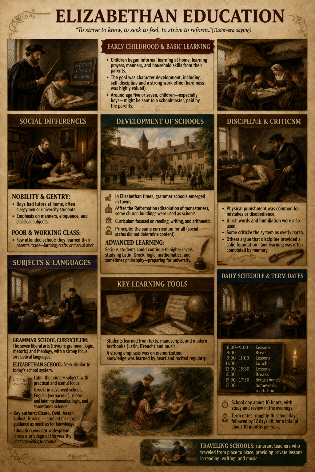 There was no shortage of schools. The Reformation, with the dissolution of monasteries, severely impacted church education. King Edward VI made an attempt at educational development, but this effort was unsuccessful. It was under Elizabeth I that these reforms were fully realized. New schools were founded throughout the country, established by various bodies or individuals. The principle was to create an education system accessible to all. This made it possible for some students to study for free or with minimal enrollment fees. Some schools determined tuition fees based on the students' backgrounds. In some cases, places were reserved for the children of local residents. Before being admitted to such schools, students had to learn to read and write. This was a difficult task because the best teachers were not focused on teaching such basic skills. Therefore, a type of preparatory education was needed. This could be part of the secondary school curriculum, or it could be a separate school. Another option was for older women to teach these basics, but often they themselves were uneducated. Since smaller secondary schools had to admit weaker students, they were forced to provide remedial education. They often hired a temporary teacher for this or entrusted the task to an older student.