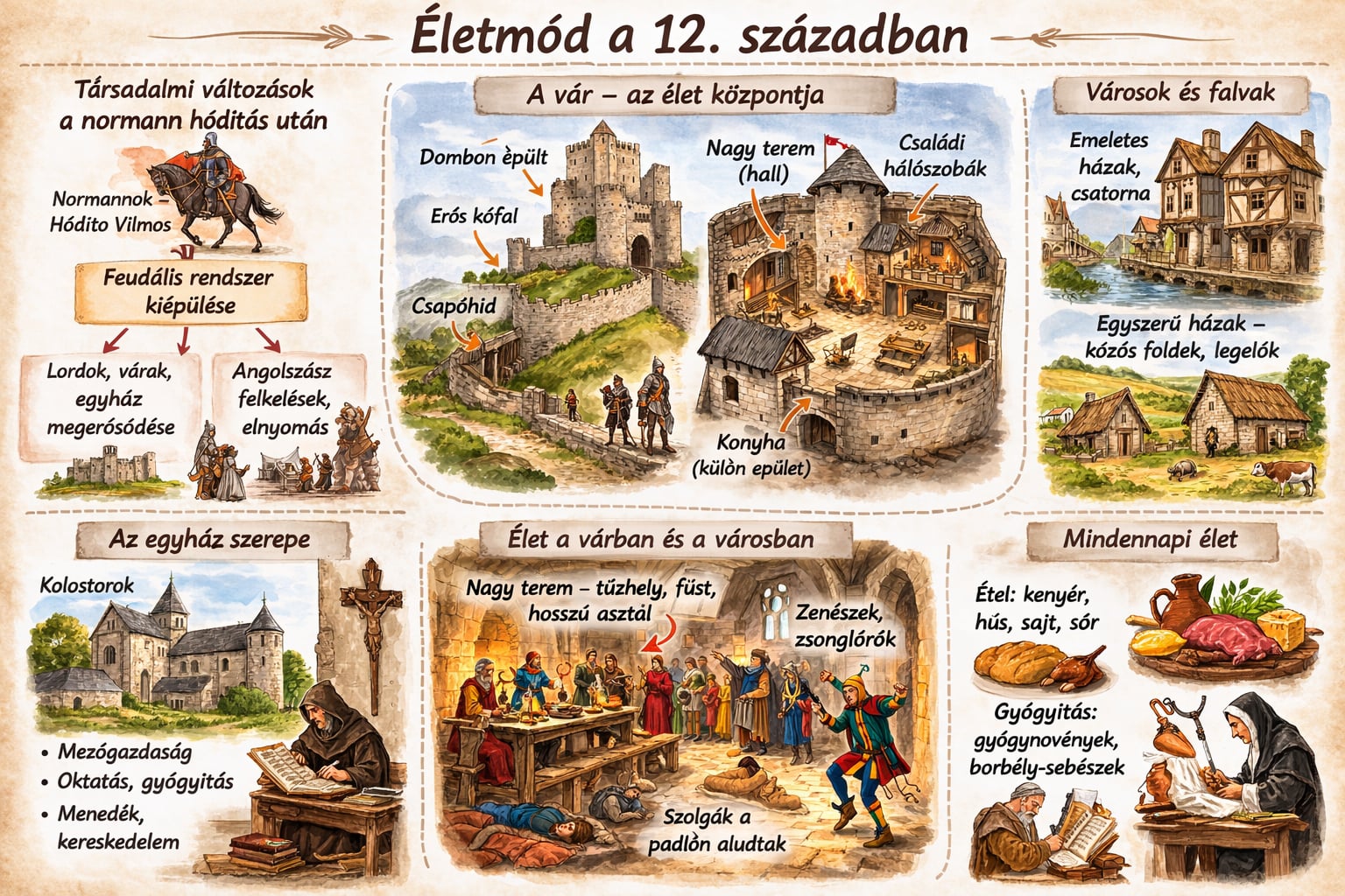 A városokban fából, kőből épült emeletes házak álltak. Belsejük a várakéhoz hasonlított, a hall mellett itt is voltak kisebb hálószobák, és konyha. A házak között csatornában vezették a vizet. A falvakban egyszerű, téglalap alaprajzú házak sorakoztak. A lakóhelyiségen kívül még konyha volt a házban, de az emberek inkább a szabadban tartózkodtak. Még hatottak az angolszász törzsi szokások, a föld a közösségé volt, együtt művelték. Voltak parasztok, akik saját földdel rendelkeztek. A közös földek fokozatosan egy-egy család kezébe kerültek, de a közös földek és legelők fennmaradtak a családi magánbirtokok mellett. Az egyház szerepének növekedésével elterjedtek a kolostorok az országban. A szerzetesek mezőgazdasági munkákkal foglalkoztak, ezen kívül szállást biztosítottak az utazó előkelőknek. A kereskedők bejártak a kolostorokba, hogy a szerzetesek beszerezhessék a szükséges iparcikkeket. Közös hálóteremben aludtak, a rászorulók részére külön betegszobát tartottak fenn, és gondosan ápolták a betegeket. Szigorú napirend szerint éltek. Szabad idejükben kéziratok másolásával foglalkoztak. Voltak nem egyházi kórházak is, meglehetősen kezdetleges felszereléssel. Az orvos maga volt a gyógyszerész is, füvekből, gyógynövényekből készített orvosságokat. A sebészet külön tudomány volt, a borbélyok foglalkoztak vele.