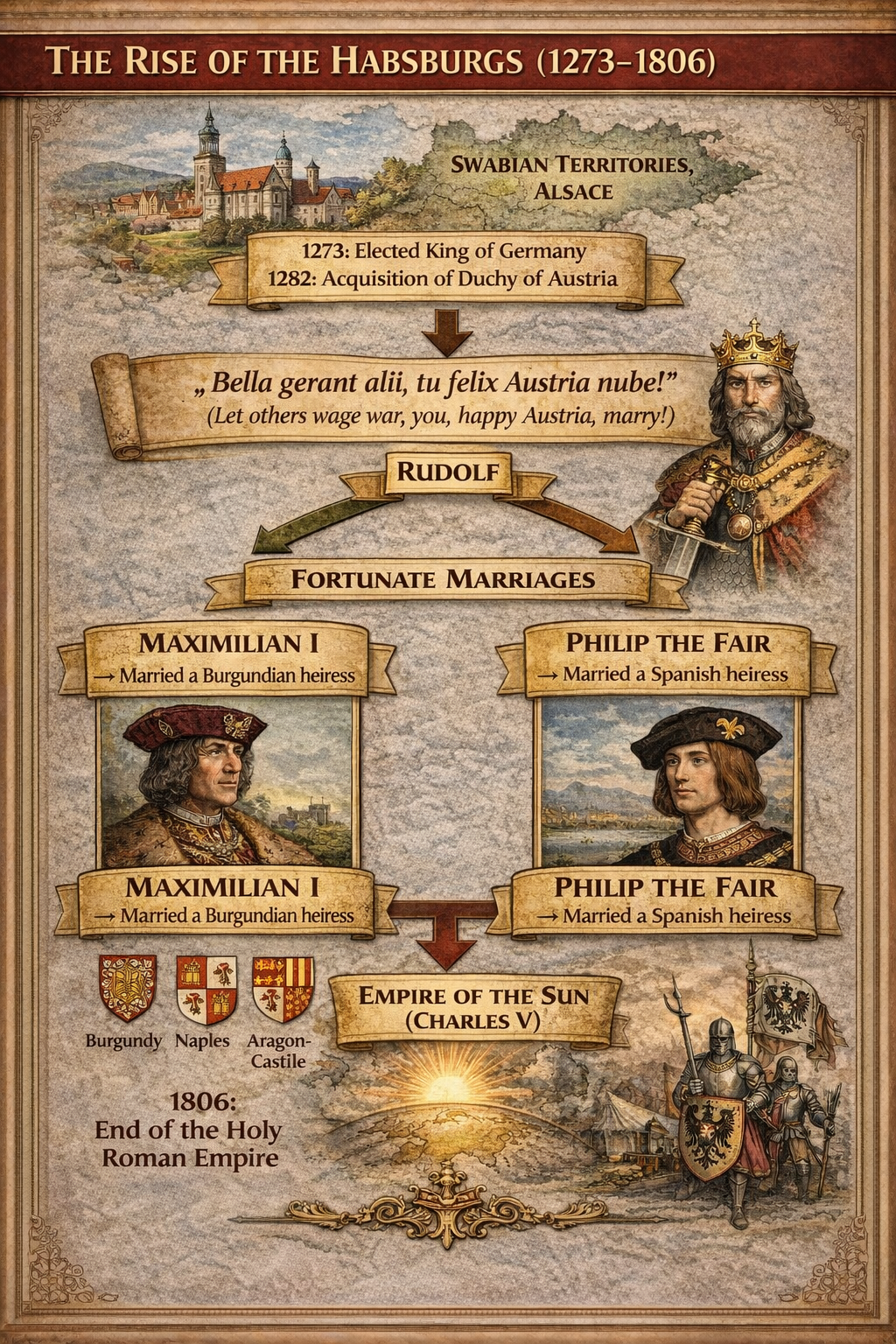 - Through fortunate marriages, they gained new territories by inheritance ("Bella gerant alii, tu felix Austria nube" – "Let others wage war; you, fortunate Austria, marry"):