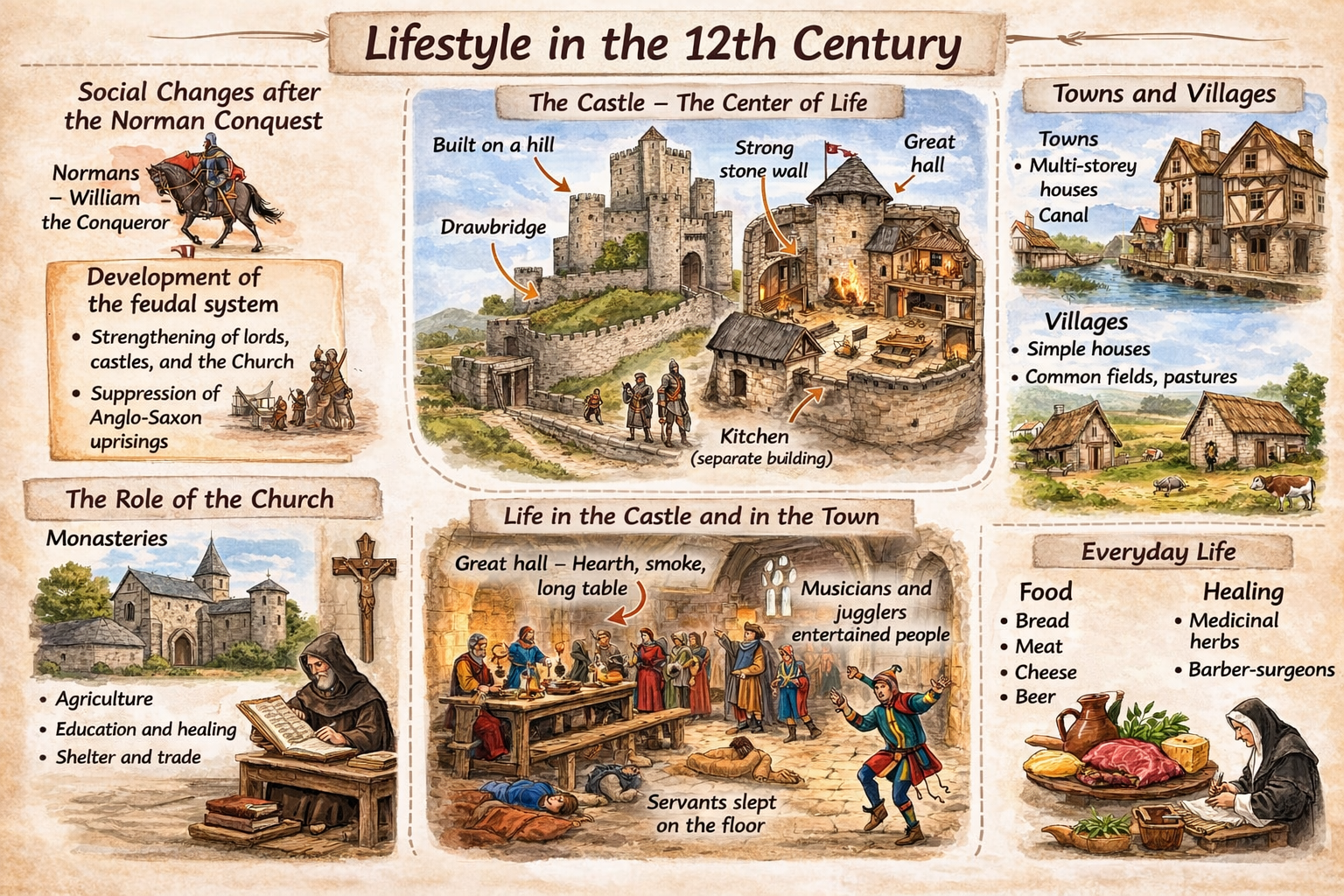 The conquest brought significant changes, including the emergence of a new social system and ruling class, as well as the introduction of a new language. The feudal system began to take shape: lords were required to provide military service, and castles and churches were constructed. The role of the Church increased, and administration was organized in line with ecclesiastical structures. These sweeping changes led to uprisings among the oppressed Anglo-Saxon population, which were met with harsh reprisals. In this climate of insecurity, castles and fortifications became increasingly important. The castles, offering protection, were under royal authority, as the king sought to prevent the barons from becoming too powerful.