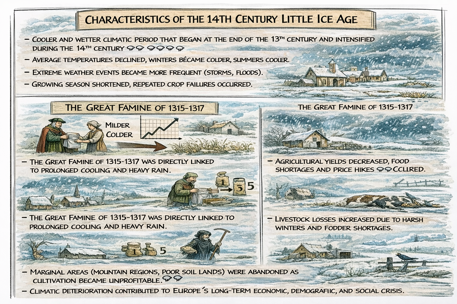 - The Great Famine of 1315–1317 was directly linked to prolonged cold and heavy rains.