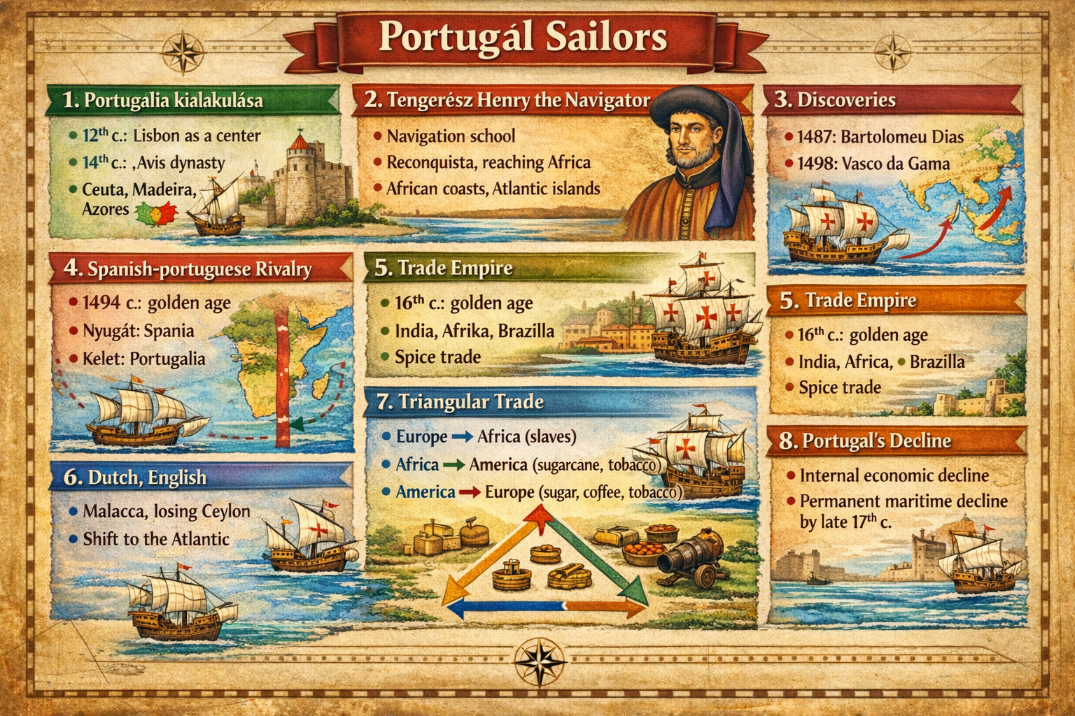 The first king of the false Burgundy dynasty, Prince Henry the Navigator (died 1460), recognized the opportunities offered by the country's favorable location and the favorable direction of ocean currents, and consciously sought to promote the nation's maritime navigation. He established the world's first naval school and gathered excellent specialists around him. His goal was to complete the Reconquista, fight the Arabs, and, with the help of the Ethiopians, capture the Holy Land. Ultimately, he wanted to establish direct links with the gold and slave markets of Africa. As a result of his policy, his successor ruled the northwest African coastline and occupied the Cape Verde Islands. Portuguese sailors explored the Congo River estuary and continued their journey south. In 1487, B. Diaz rounded the southern tip of Africa, which the Portuguese king named the Cape of Good Hope.