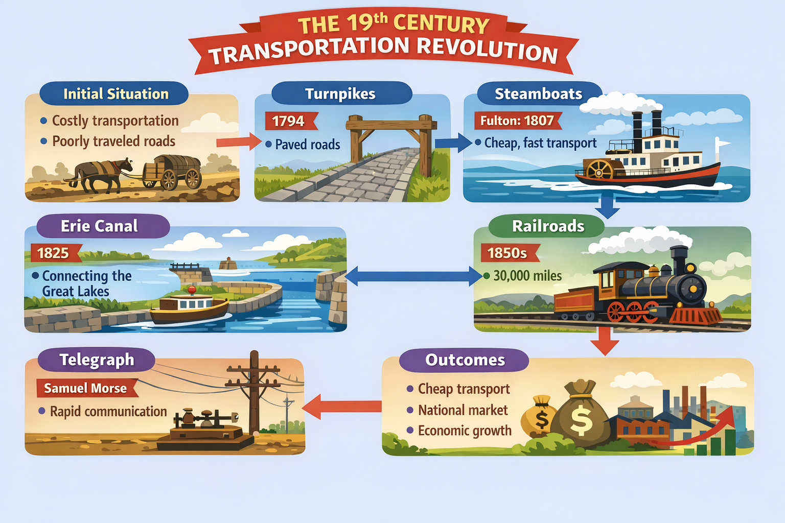 The development of transportation in the 19th century is referred to by some historians as the "transportation revolution." This revolution was both a cause and a consequence of the market revolution.